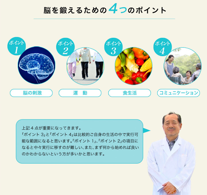 徐々に体力が落ちていったりすることと同じように、脳の機能も誰でも加齢と共に低下します。ごく自然のことなのです。加齢により脳が衰え物忘れが多くなったり、言いたい言葉が出にくくなったりしますが、脳を鍛えると、このような症状が改善される可能性はあるのです。 それでは脳を鍛えるには実際どうしたら良いのでしょうか? 脳を鍛えるための4つのポイント